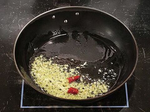 作り方 ①フライパンにオリーブを入れ包丁の背でつぶしたニンニクと 半分に切った干し唐辛子を入れ弱火でじっくりと香りをうつ し.
