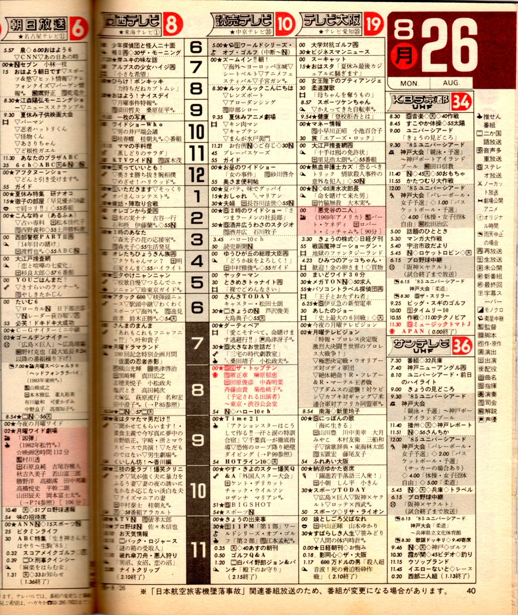 1 名無しさん おーぷん 15 08 12 水 00 05 26 Id Vhu昔のテレビ 欄を淡々と貼るスレ他のスレで貼ったやつも混じってるが気にするなというわけで30年前の今日 1985年8月12日 昔 テレビ いく