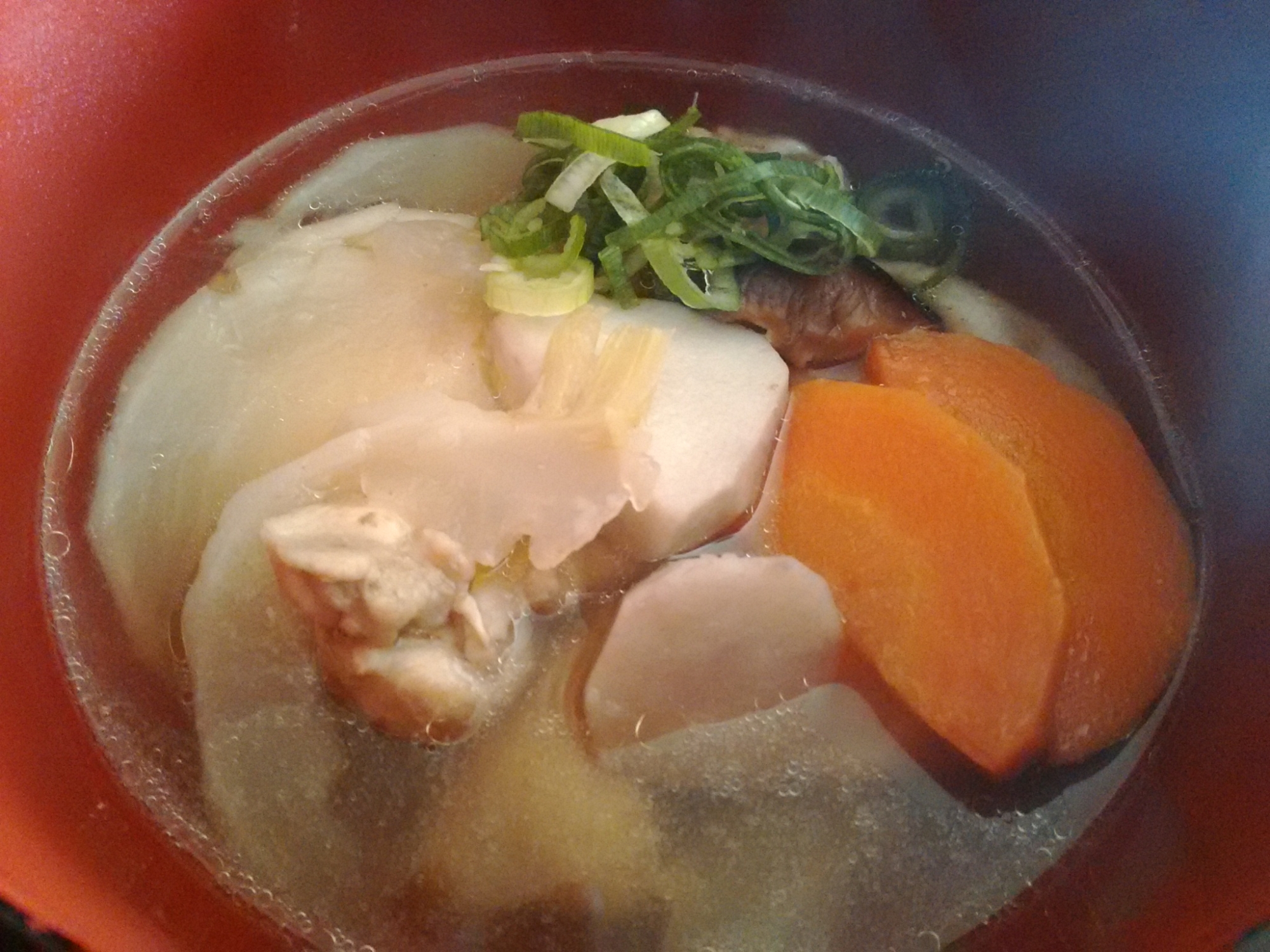 Cooking 毎年 お雑煮はテキトーに作ります とくにこだわりとか伝統とかないです 笑 ひとまず 昆布ダシ 干しシイタケ の戻し汁 ゴボウ 鶏肉 の組み合わせにしておけば間違いないです 透明スープに薄くスライスしたお野菜を入れます 鶏肉は美味しいもも肉にし